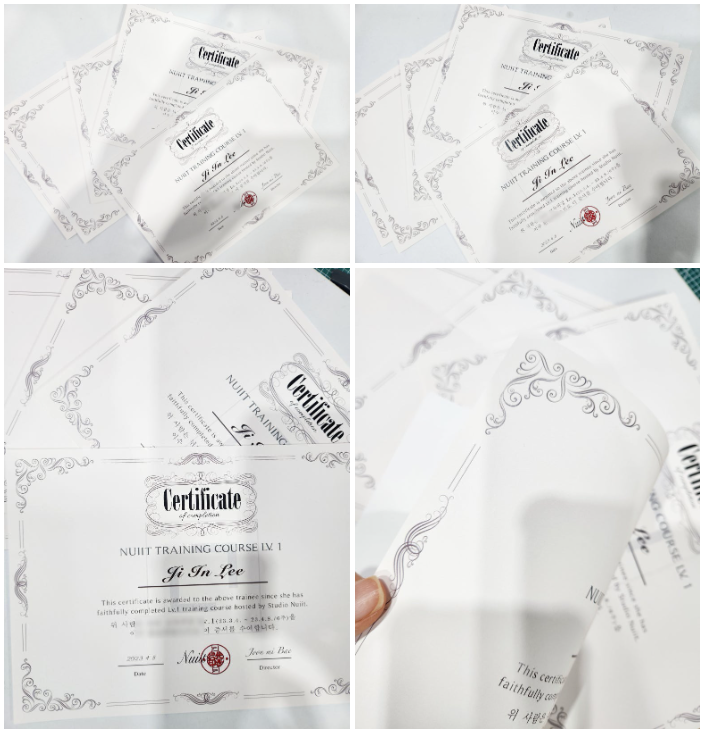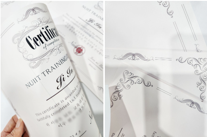 수료증이나 인증서는 좀 두꺼감이 있는 고급지를 사용합니다