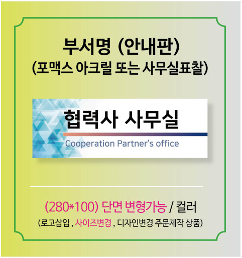 | 부서표시판 안내판 사무실표찰 부서명안내 부서명표지판 [포맥스또는 아크릴, 폼보드] 기본사이즈 270X100 (변형가능) (0) | 2024.09.29 |